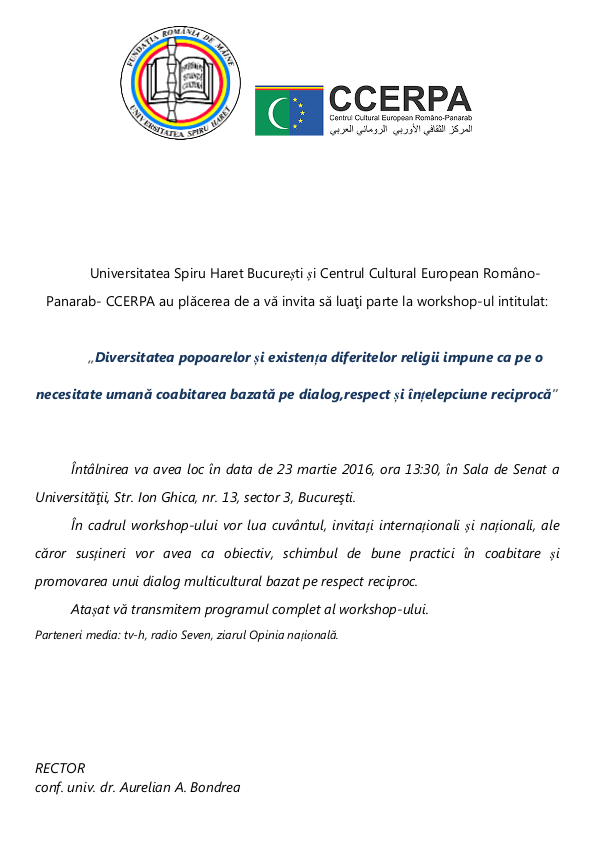 Universitatea Spiru Haret București și Centrul Cultural European Româno-Panarab- CCERPA au plăcerea de a vă invita să luaţi parte la workshop-ul intitulat: